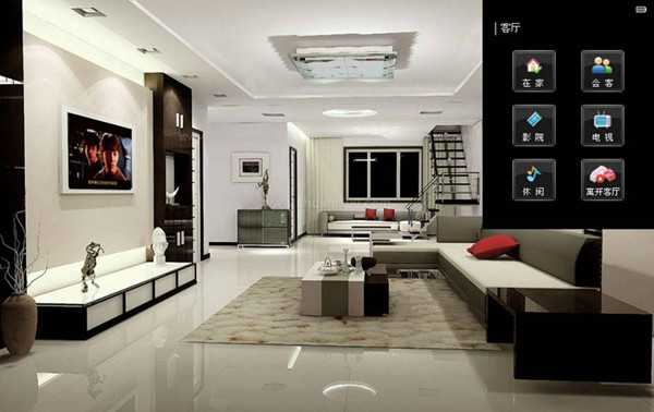 會客模式:按下場景面板上的“會客模式”按鍵,房間的燈光變亮了、電視機關閉、并響起了舒緩的背景音樂歡迎客人的到來。